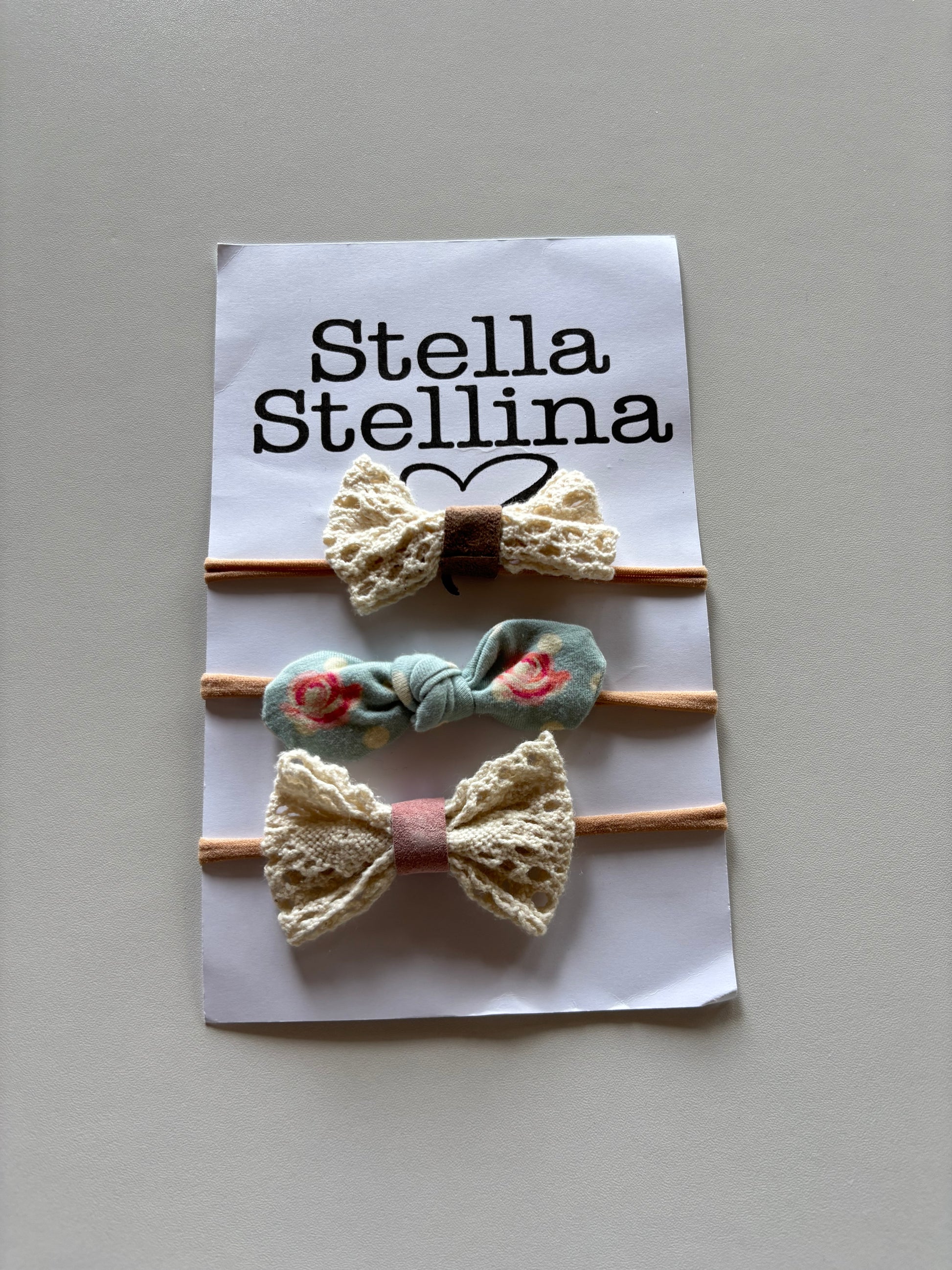 Stella Stellina one size. Soft and stretchy. Beige nylon with upcycled crochet and fabric bows.