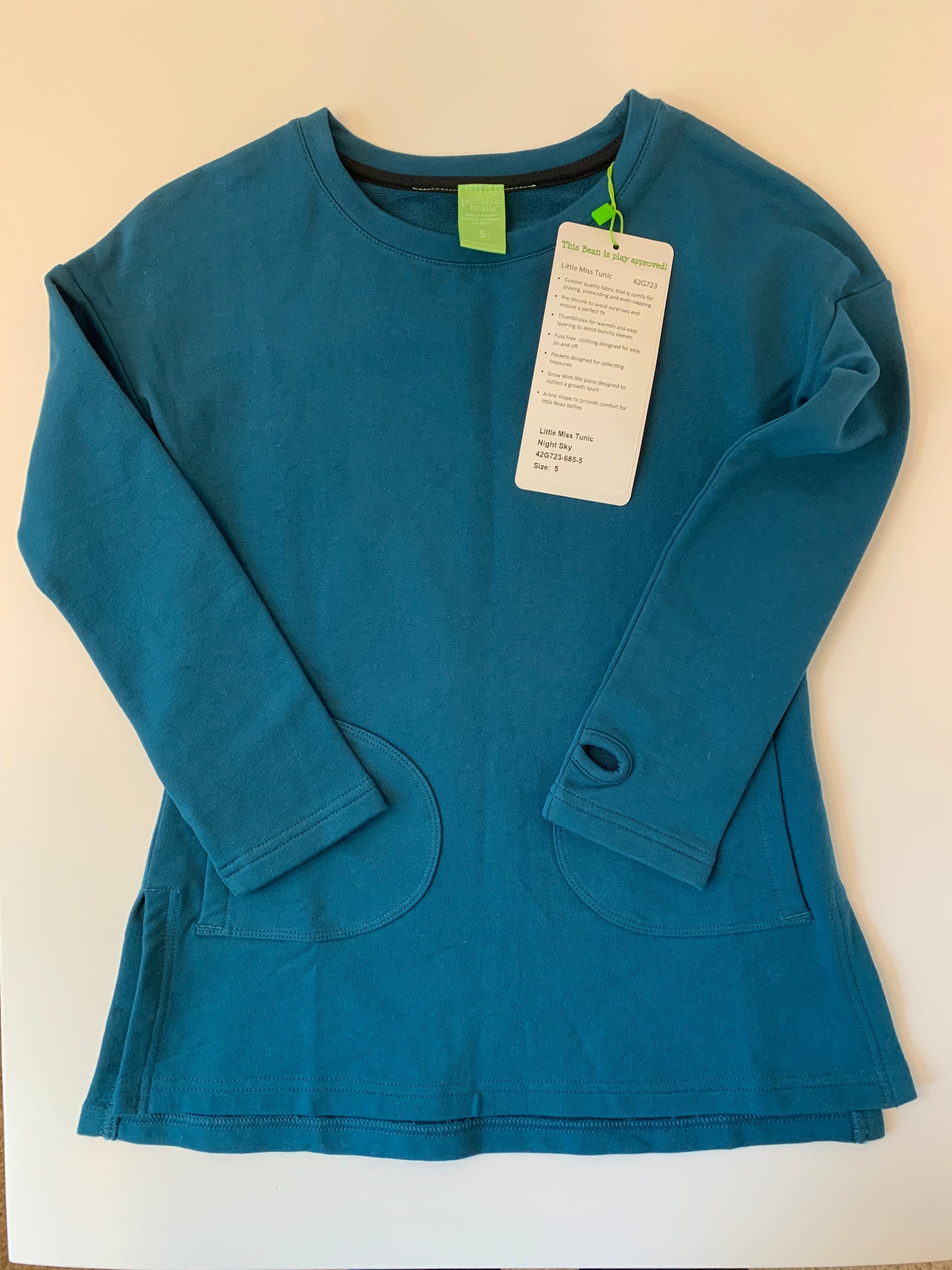 BNWT Peekaboo Beans (PK Beans) tunic in "night sky" (turquoise). Pockets, thumbholes, slits up the side for easy bending, PK Beans always thinks of everything.