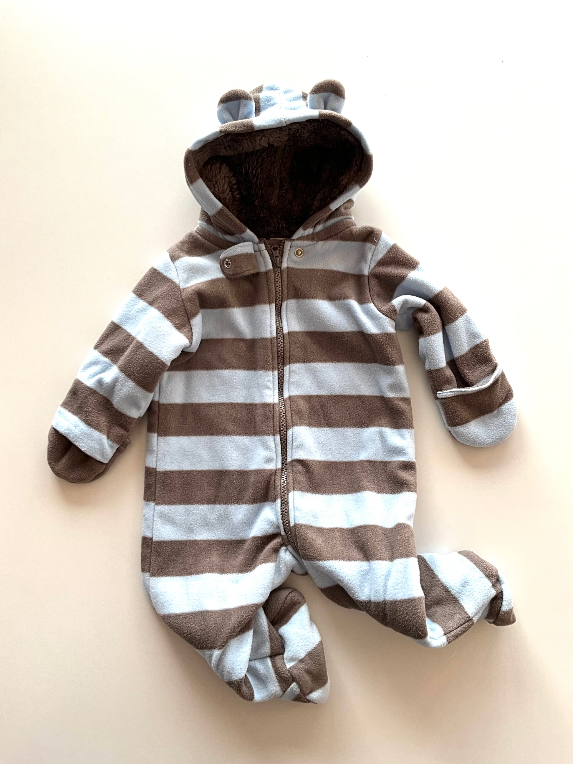 Carter's 6 months. Blue & taupe stripes, hood with ears, footed, attached hand mittens.